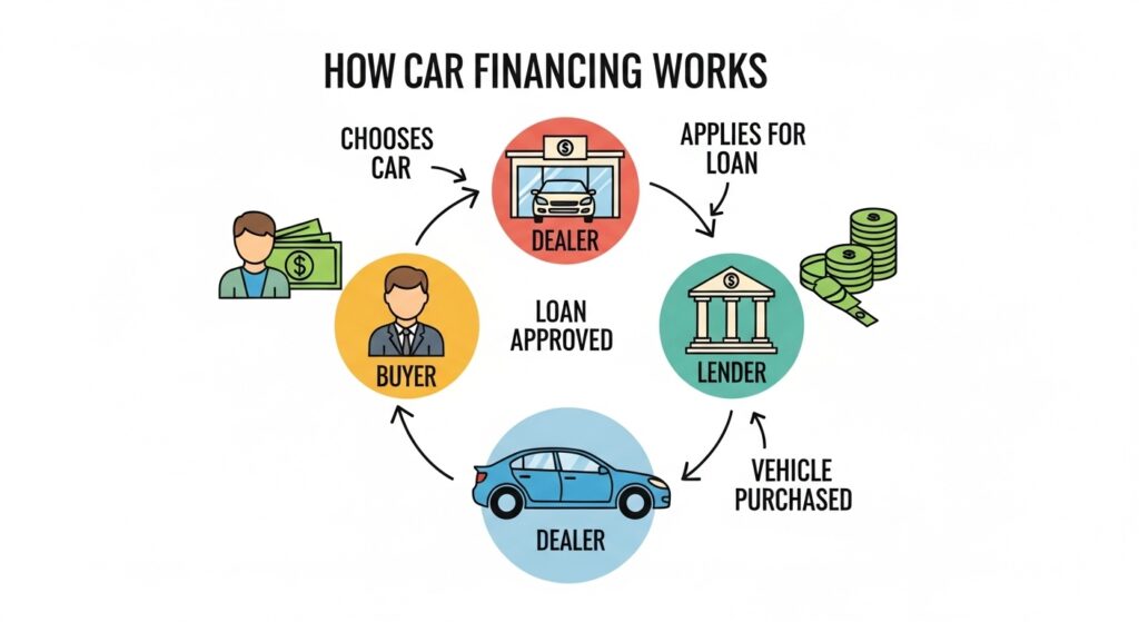 When you finance a car, the lender pays the dealer the total cost of the vehicle. You, as the borrower, then agree to pay the lender back over a fixed period—usually between 36 and 72 months—with added interest.